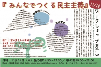 ☆☆☆☆☆☆☆☆☆☆☆☆☆☆☆☆☆☆☆☆☆☆☆☆☆☆☆☆ みんなでつくる民主主義ワークショップvol.3@カフェオハナ 〜街に飛び出せ実践スペシャル〜 ☆☆☆☆☆☆☆☆☆☆☆☆☆☆☆☆☆☆☆☆☆☆☆☆☆☆☆☆ 11/14は『特定秘密保護法案 一斉キャンペーンデー』! (http://www.himituho.com/) みん民ワークショップでも、 「特定秘密保護法をめぐる街頭コミュニケーション」をテーマに、 アイデア出しから作戦会議、 実際の街頭で実践までをおこないます。 ----------------------------- 原発、食の安全、憲法改正、、、 今まで知らなか...