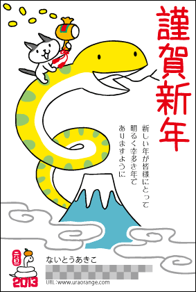 JUGEMテーマ:イラスト JUGEMテーマ:手紙(葉書、年賀状、絵手紙、暑中見舞い、寒中見舞い) あけましておめでとうございます 巳年ですね ヘビって、本物はちょっとギョッとするけど イラストとかグッズになるとイイ感じにカワイくなりますね 今年の年賀状は、こんなへびさんでした(ちょっとバケラッタ入ってる) 本年もどうぞよろしくお願いいたしますヽ(´ー`)ノ