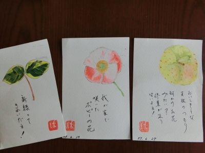 絵手紙をやってみたいと、 お義母さんから、嬉しいお言葉。 そこで早速、絵手紙サークルに 一緒に行きました。 まずは、消しゴムハンコを作って・・・ 初心者は葉っぱから描きます。 とても楽しかったと、言ってくれたお義母さん。 もう我が家に、3枚も、 絵手紙届けてくれました お義母さん、がんばってる〜 よ〜し、私もがんばろう!!! 一緒に楽しむものができて、しあわせ