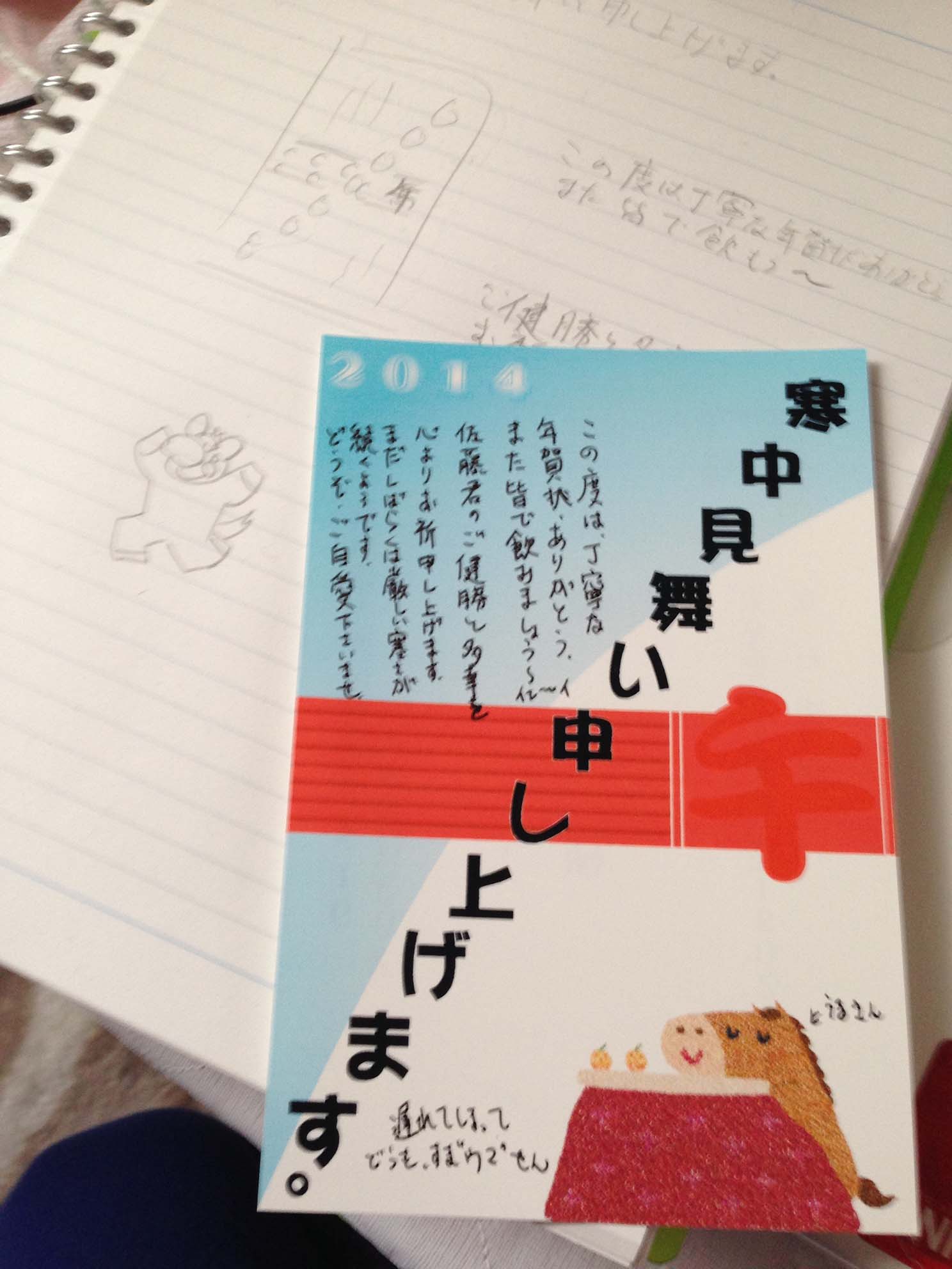 JUGEMテーマ:手紙(葉書、年賀状、絵手紙、暑中見舞い、寒中見舞い) 学生時代の友人から年賀状をもらってのですが、 年賀状を出しそびれ、寒中見舞いを出そうとおもっていて やっと先日だしました。それがこれだ!!! といっても、たいした事ないですが〜〜〜 こんなかんじです。 ご覧になっていただいか方に、お聞きしたいのですが これ、どうでしょうか?