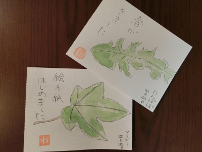 この春、新しいことを始めました。 以前から興味があった 絵手紙教室に入ったんです。 今日はその一回目。 初心者はまず葉っぱから。 アイビーとたんぽぽの葉っぱを 描いてみました。 これから楽しくなりそうです。