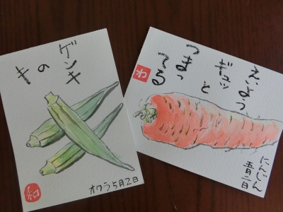 5月の絵手紙教室に行ってきました。 教室ではそれぞれ描きたい題材を 持参します。 前回初めて参加した時、 先生が、野菜も描くと良いよと 教えてくださいました。 そこで今回は家にあった 人参、オクラ、しめじ、エリンギを 持っていきました。 これ、ししとう?って言われちゃったけど 良いんです、大丈夫。 絵手紙は、下手でいい、下手がいい・・・のだそうです。 ただ10月には交流館のふれあい祭りがあり、 一人2作品を展示するとか・・・。 わあ、全然大丈夫じゃないよ〜〜〜