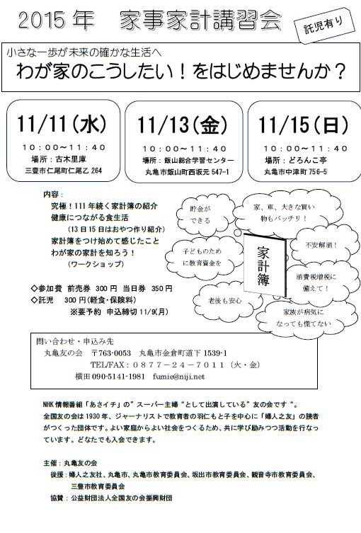 JUGEMテーマ:お知らせ JUGEMテーマ:日々を楽しく JUGEMテーマ:家計簿 丸亀友の会から家事家計講習会のチラシが届きました。 丸亀友の会家事家計講習会のパンフレットはこちらから