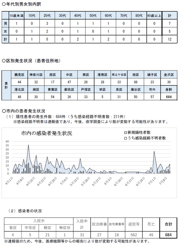 本日(10日)市内で、新たに新型コロナウイルスに感染した患者が12名確認されました。 この患者の感染経路については、現在調査中です。 引き続き、積極的疫学調査を確実に行っていきます。 (健康福祉局健康安全課発表) 人権尊重・個人情報保護に御理解と御配慮をお願いします。 JUGEMテーマ:災害対策