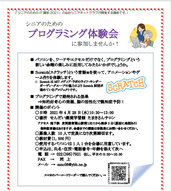 JUGEMテーマ:習い事・資格・講座 「脳の活性化で認知症予防!」 プログラミングスクラッチ体験で楽しいシニアライフを過ごしましょう!