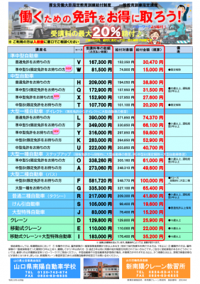 令和3年4月1日スタートの 教育訓練給付金制の指定講座一覧です! 準中型車から中型、大型、 けん引に大型特殊、 普通二種に大型二種、 天井クレーンに移動式クレーン 全部で21講座! この中から自分にピッタリの 講座を見つけてお得にスキルアップ! 教育訓練給付金制度(一般教育訓練)は 一定の条件を満たした方が 講座を受講し修了した場合、 支払った受講料のうち 最大20%(上限10万円)が 国から支給されます。 ...