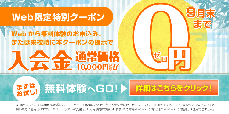 JUGEMテーマ:習い事・資格・講座 JUGEMテーマ:パソコン教室 山陽電車別府駅からすぐ、加古川市別府町のイトーヨーカドー加古川店内にあります、 ハロー!パソコン教室です。 駅からすぐなので、尾上や浜の宮はもちろん、近隣の加古郡播磨町などからも、たくさんの生徒様が通ってらっしゃいます。 こんにちは! ハロー!パソコン教室イトーヨーカドー加古川校インストラクターのカジヤマです。 新しいキャンペーンが始まりました!入会金11,000円が無料になります♪ ※適用条件あ...