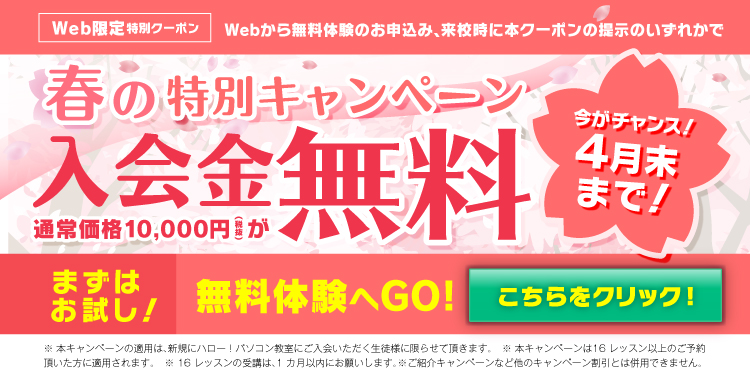 JUGEMテーマ:習い事・資格・講座 こんにちは!! みなさん、お元気でしょうか? 我が家は、子供たちが毎日家にいて3食ずっと作るのが大変だなぁ… と思う反面、子供たちが皿洗いや、お風呂掃除をしてくれるようになりました。 このまま、休みが明けても続けて欲しいです(*´ω`*) さてさて、春の特大キャンペーンのお知らせです!!! 今なら、入会金が無料です♪ スマホやパソコンレッスン始めてみませんか? お気軽にお問合せくださいね☆彡