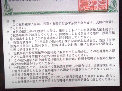安倍が衆議院を解散するとニュースが流れた頃、写真の『在外選挙人証』を仕舞い込んでいた引き出しから取り出した。在外選挙人証というのは海外に住んでいても日本の国政選挙に投票できる人の証明書で、小生の場合、2016年3月に取得した。 【変則的なサイズだが裏面には投票履歴が記載されているから便利】 この制度は2005年に選挙法が改定され施行されたが、当初は比例だけの投票しかできなかった。しかしその制度に対して違憲訴訟が起き、2007年に最高裁で違憲判決が出て地方区にも投票ができるようになった。 最...