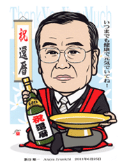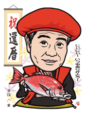 還暦祝い『鈴木ゲンお祝い似顔絵』お見積り依頼はホームページ の「注文の際の注意事項」を必ず確認し、了解の後、下記の必要項目の内容をメール でお知らせ下さい。 【お見積もり必要項目】 1.似顔絵モデルのお名前とローマ字読み/ 2.似顔絵の仕上り到着の日時/ 3.似顔絵に入る『贈る言葉』と日付け/ 4.依頼者の、郵便番号、住所、名前、電話、メールアドレス/ 5.似顔絵を制作する人数と「胸上/胴上/全身の各タイプの指定」/ 6.その他に描き入れる絵の内容、小物など/ 7.必ず「ご注文の際の注意事...