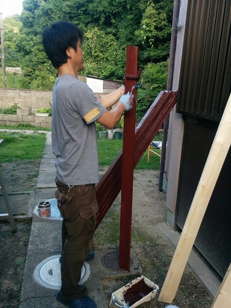 JUGEMテーマ:ゲストハウス 昨日のブログに続きウッドフェンス作っています(中編)です。 本当に雨たくさん降りますねぇ〜ウッドフェンスを仕上げたかったんですが、当分無理そうです。 それでも、4日(水)は天気も良かったのでウッドフェンス用の1×4材に塗装をしました。まずはローラーで下地に色をつけます。昨年ウッドフェンスを作った時は単管パイプで作業台を作ってその上で塗りましたが、今回は本数も少ないので1本ずつ塗...