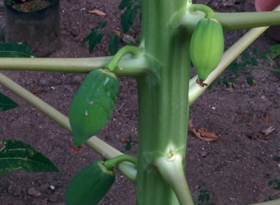 庭のパパイヤが幼果をつけました! 数えたところ、今現在10個ほどありました。 樹自体も大きくなり3本とも170cmを超えています。 でも実がついているものはまだ手前の1本だけです。 花もまだたくさんついているので実も増えそうです。 パパイヤは3本育てていますが、実は同じものではありません。 奥の2本のまだ実がなってないはホームセンターで380円で買った苗から育てているもので ...