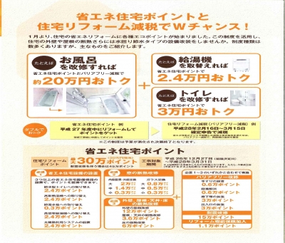JUGEMテーマ:リフォーム ポイント申請の開始が3月10日よりスタート致しました。 住宅改修の箇所により、ポイントが決められており 今回は最大300,000万ポイントのチャンスが! (1ポイント=1円相当)(※耐震改修を行った場合は、+150,000ポイント) ポイント申請期限は遅くても平成27年11月30日となってはいますが、予算に到達次第打ち切りとなります。今回は前回の時と比べて予算が少ない為、早期終了が予測されています。 エコポイントを活用してリフォームをご検討されたい方はお早目にご検討、またご相談頂ければと思...