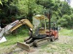 JUGEMテーマ:リフォーム バックホーの傘を外します。 傘のボルトを全部取り外し、 フォークリフトを傘に差し入れて、 ジワジワと持ち上げます。 あら、バックホーまで吊り上がってる。 てか、フォークリフトのタイヤが浮き上がってる。 よく見るとボルト一本外し忘れ。 で、外して再挑戦。 途中まで吊り上げましたが、 バランスを崩してつめが外れて転倒。 ま、外れたので良し。 お昼から母屋に突入。 &nbs...