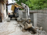 JUGEMテーマ:リフォーム 斜めに傾いたブロック塀。 何とか元に戻す方向で検討しています。 失敗したら壊して取り外すことにしました。 今日はユンボのバケットで押す作戦。 少し力をかけて押してみました。 ビクともしないかと思っていたのですが、 ブロックに取り付けてある補強用のブロックを押せば動くことが判明。 少し安心です。 そこで、ブロック塀の根元を掘り返して石を投入し基礎固めをすることにしました。 一旦ユンボをブロック塀と平行にしてバケットで掘削。 バ...