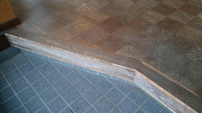 JUGEMテーマ:リフォーム 築古戸建の玄関框です。 経年劣化でボロボロです。 これをなるべく低コストで仕上げてほしいとのコト。 ということで、框の芯はしっかりしているので、正面に糊をタップリとつけてベニヤ板をビス止めしちゃいます。 框の上面は、単板を剥がしてしまいます。そうすると、しっかりした芯材がでてきました。 これに、アースタックで下地処理。 クッションフロアーの貼り込み! ...