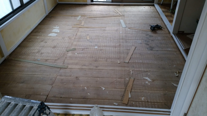 JUGEMテーマ:リフォーム 今日のお仕事・・・ 画像は和室6畳の、畳を撤去した状態です。 まずは、根太組み。 そして、ベニヤ貼り!完了。