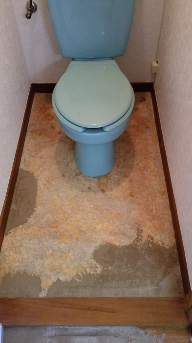JUGEMテーマ:リフォーム 埼玉県のとある賃貸物件の1室の原状回復工事です。 まずはトイレ。古いクッションフロアーを剥がした状態。 ・・・このブルーの便器の色のクセが強い! クッションフロアーの選定の色としては便器の色に合わせたブルー系か・・・ニュートラル色の白系か・・・。 今回は現在イチオシの茶系を貼ってみました! やっぱり、ブルーのクセが強い! リリカラ LH−80805 続いてキッチン。 古いクッションフロアーを剥がして下地処...