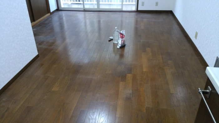 JUGEMテーマ:リフォーム とある一戸建てのダイニングキッチンです。フローリングの汚れ、劣化が酷いので上からクッションフロアーを貼って欲しいとの依頼です。 真ん中には何が置いてあるかというと・・・大事な下地処理の「アースタック」とそれに使う水とパテベラなんです。 これを使って、フローリングのジョイント部分にアースタックを塗り込みます。(下地処理) 下地処理が終わったら、やすり掛けをしてクッションフロアーを貼っていきます。 bifo- afuta- bifo- afuta-...