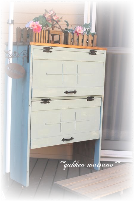 去年、自分でつくった靴箱! 「教室ブログに載せてください^^」と、会員保護者の方からのご要望により、 ちょいと失敗作の靴箱DIY作品を載せてみます。。 外に置きっぱなしなので、杉の木にしました 結構硬く、DIY初心者には大変でした・・・ 自分の持っていたドリルでは威力が足りなくて、結局は主人のインパクトをお借りして 子供たちが扱うものなので、すぐに汚れるだろうと思い、 白→緑のミルクペイント重ね塗りのあと、やすりで少し削り、傷をつけておきました 靴受けは3段作り、...
