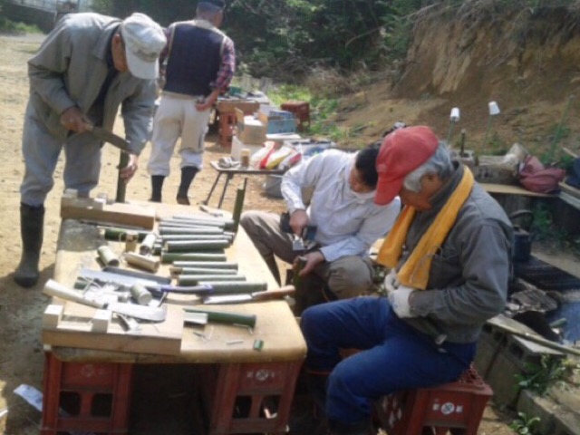 JUGEMテーマ:里山p 4月度の炭焼きの日です。今日は来週に迫った小野路やまいちでの販売品の準備もあり、朝7時からメンバーはいつもの無駄口も少なめにせっせと作業を進めています。小野路やまいちでは販売のほかに「竹製のけん玉作り」のワークショップをやろうということにしており、その検討も並行して行われています。検討風景から察すると、年寄りも夢中になるくらいの楽しいけん玉作りのプロセスが固まりつつあるようです
