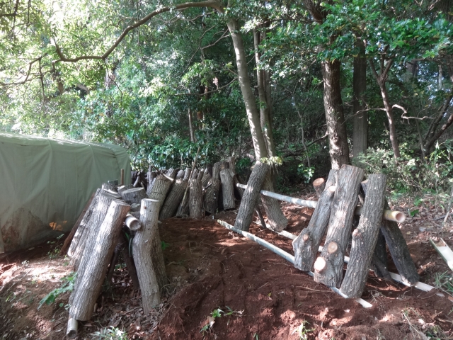 JUGEMテーマ:里山 5月の小野路里山はやりたいことが山積みです。その一つが仮伏せしてある椎茸ホダ木25本の本伏せです。城山農場の椎茸ホダ木置き場は過去4年分のホダ木約100本で既に満杯なので、当初はサイクルハウスを1メートルくらい横に移動して、五か所(5年分)のホダ木掛けが入るようにレイアウト変更する予定でしたが、それには100本のホダ木をあちこち移動させる必要があり、体力的に断念。5年前のホダ木を処分して、その跡地に今年の分を立て掛けることにしました。片付け始めた5年前のホダ木はすっかり軽くなっています...