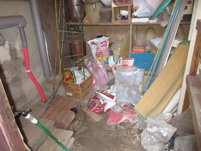 農家住宅の・・・ 母屋の前に10数年前に大黒柱のある、で〜っかい離れが 渡り廊下も含めて建てられた。 そこへ・・・ 娘さんの家族が住まわれるために、二階が水回り。 玄関の・・・ 式台・上り框と大黒柱は無垢のケヤキ板。 天井は「格天井(ごうてんじょう)」と言う立派な 造りなので、天井を剥ぐわけにもなりません。 玄関の上が台所・・・ 子供室だった場所に台所・浴室・洗面・トイレを配置した。 そのために配管スペースに困った! 工夫をして・・・ 車庫の天井裏に全ての配管...