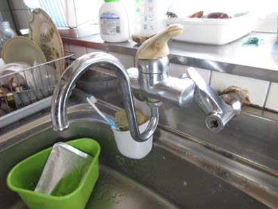 築30年・・・ 当時の流し台は80cmと低いので10年ほど前に 5cm流し台をゲタを履かせて高くされた。 流し台には・・・ 奥側にバックガードと呼ばれる9cmの水返しがある。 そのために・・・ かさ上げすると壁から出ている水栓金具が当たるので バックガードを無理矢理削って取り付けてあった。 そうすると・・・ スパウトと呼ばれる吐水口が鍋にあたるので ホームセンターでS型のスパウトに取り替えられた。 老朽化に伴い・・・ レバーのあたりから水漏れがするようになり ...