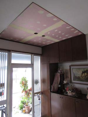 築40年以上・・・ 様々な場所が老朽化や経年劣化により痛んでいます。 普通の業者さんなら・・・ 「建て替えた方が早いですよ!」などと 言われそうな物件ですが、それぞれのご家庭で それぞれのご都合があります。 「必要最小限にして下さい!」と。 ご要望に応じて・・・ 部分的な補修をさせて頂きます。 このたびは・・・ 洗面所の天井部に雨漏りがありました。 漏れ出して既に10年以上は経過しているか?と。 厚さの違う部材で補修がしてありました。 天井板...