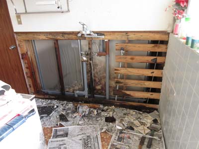 鉄骨アパートの・・・ 二階から水漏れがあって、原因を探すのに大変! お医者様が使っている・・・ 聴診器をあちらこちらに当てて、とうとう発見! 流し台の蛇口付近から・・・ かすかに漏れているような?気配?がします。 「えいやっ!」と・・・ 解体してみたら、案の定ピンホールの水漏れ発見! 少しずつ何年間も漏れ、既に木材は腐れていました。 しかし・・・ 流し台の裏なので、毎日使う場所です。 しばらくお休みするわけにもなりません。 さっそく・・・ ...