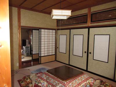 築90年以上の古民家です・・・ 今回で7回目、親子2代にわたってのリピート工事です。 家族構成が・・・ 変わったのを機会に部屋のあり方を変えます!と。 田の字造りの・・・ 田舎の家は、回り縁側に囲まれていて、床の間の 裏側の部屋が比較的明かりも少なく薄暗い。 ベッドの生活を、と・・・ 和室を洋室風にアレンジして下さいとのご要望です。 ついでに縁側も部屋に取り込んで広く使います。 天井板は・・・ 2階の座板がそのまま化粧になっています。 板の隙間からゴミも落ち...