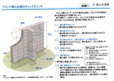 先日・・・ ブログにUPしたところお問合せがあったので ブロック塀のチェックポイントとして国交省から 資料が出ていたので、ご案内します。 ?塀は高すぎませんか? ・塀の高さは地盤から2.2m以下ですか? ?塀の厚さは十分ですか? ・厚さは10cm以上ありますか? ?控え壁はありますか? ・長さ3.4m以下ごとにありますか? ?基礎はありますか? ・コンクリートの基礎があるか? ?塀は健全ですか? ・傾きやひび割れがありませんか? ?塀に鉄筋は入っていますか? ・9mm以...
