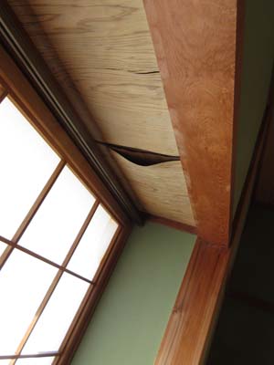 雨漏りがします! 北向きから、風を伴う雨が降ると漏れます! しとしと雨なら・・・ そんなに漏れないんですけど! 早速出かけます 築90年ほど、田の字造りの農家住宅です。 回り縁側の、書院付近から漏れています。 屋根に上ってみると・・・ 『掛け戸板』と呼ばれる「鎧張り」の外壁。 1cm程の厚さの杉板・・・ それを押さえる縦桟で止めてあります。 90年の間・・・ 杉板は劣化して、紙のような薄さにまで! 風雨に打たれて再下段にある「水切り板」...