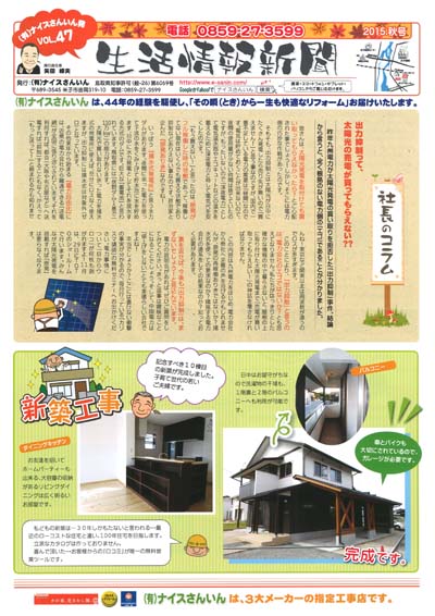 年4回・・・ 季刊誌として発行している「生活情報新聞」の 秋号ができあがりました。 今回のコラムは・・・ 太陽光が発電した電力を買い取らない「出力抑制」 について言及しています。 原子力発電所も・・・ 揚水式水力発電所もフル稼働であれば、 抑制は仕方がないことも考えられますが。。 裏面は・・・ いま超人気の『水素水』の話題です。 キッチンの上に置くタイプと、蛇口を入れ替えるタイプ。 どちらも「効能」は同じですが、ご予算に応じて。。 詳しくは・・・←クリック 今回も・・・ 読んで「お得」な話題があり...