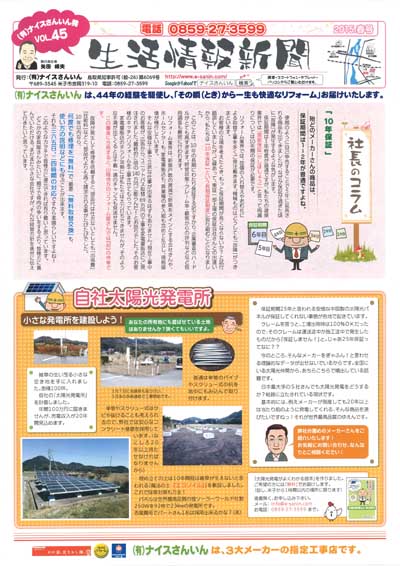 年4回・・・ 季刊誌として発行している『生活情報新聞』春号 刷り上がったので、昨日発送しました。 リフォーム業界では・・・ 5年保証とか10年保証とか、 長期間にわたる『保証制度』を求められるような時代です。 弊社でも・・・ 業界に先駆けて10年保証を取り組むべく 現在審査中、そんな話題が表紙を賑わしています。 One Day(ワンデー)リフォーム。 1日で玄関を取り替えましょう! 事件簿では・・・ とんでもない事件が起きた現場からです。 そして、そして・・・ ニューフェースのご紹介です。 米子市の・・・ 超優...