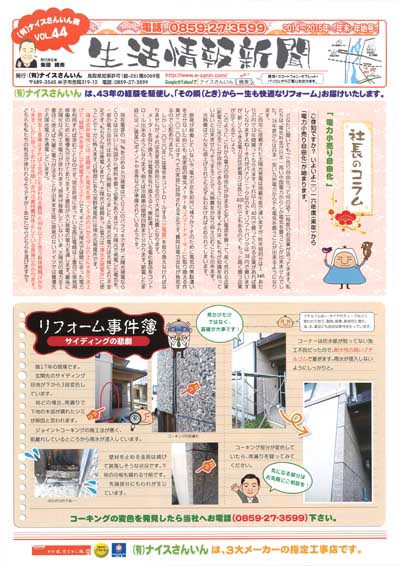 とうとう今年も・・・ 残り4日となって参りました。 毎年4回・・・ 記事を作りながら、現場での出来事などを 印刷してお届けしている『生活情報新聞』です。 年4回ですから・・・ 今回で44回目=11年を過ぎました。 秋口から余りにも多忙で・・・ 原稿を書く余裕も無く、今日まで。。 年賀状も・・・ 120枚ほど、手書きで書き本日ポストへ。 本日事務所へ帰ると・・・ 新聞が届いていたので、 これから袋詰めの作業が待っています。 弊社のキャラクター『おぢさん』は・・・ 縁起を担いで「一富士・二鷹・三茄子」の装いです(笑)...