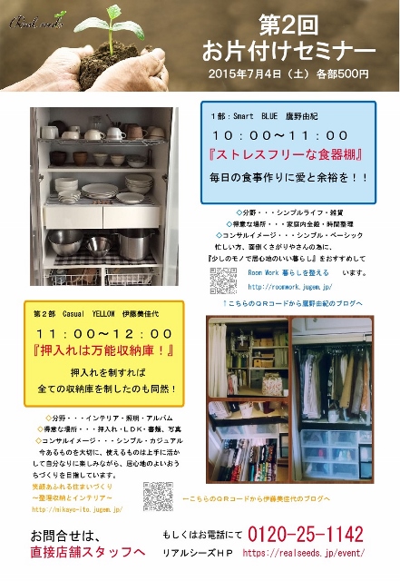 こんばんは! 整理収納☆インテリアアドバイザー 伊藤美佳代です♪ 7/4(土)のリアルシーズ専属 Team Active ワンコインセミナーの ポスターを作成しました! 少人数で、ゆっくり聞けるセミナーですよ! 終了後、ランチ会(料金別)も予定しております。 お申し込み、ぜひお待ちしております♪ お申し込みは、リアルシーズ または、こちらまで → mikayo.i.1014@gmail.com 今日も、最後までお読みいただきありがとうございます。 JUGEMテーマ:整理収納