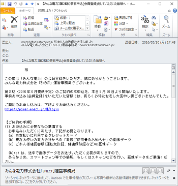 JUGEMテーマ:エコライフ 4月の電力自由化には間に合わなかったものの、ようやく「みんな電力」より申し込み受付のメールが届いたので、さっそく申し込んでみることとします。 ▲みんな電力からのメール