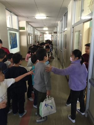 月に3回の古紙回収をしています。 20分休みになると、次々に子どもたちが新聞や牛乳パックを持ってきます。 古新聞や、牛乳パックを持ってくるとエコチケットがもらえます。 図工室に順番に入ると、環境委員さんが受け取ってくれます。 出口のところで、環境委員さんがエコチケットを渡してくれます。 これが、エコ市場で使えます。