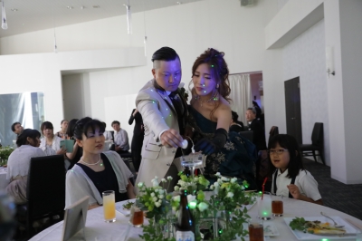 JUGEMテーマ:結婚式 こんにちは(^^♪ また台風が来ていますね(/_;) 今年は多いですね〜💦💦💦 今日は7月22日の KさんAさんの披露宴の続きを ご紹介します♪ お二人は各卓をまわり 花びらを入れると液体が光る 『フラワーイリュージョン』 会場内が幻想的な雰囲気に🌸 続いては各卓の皆様から 代表の方に出てきていただいて 『ハ...