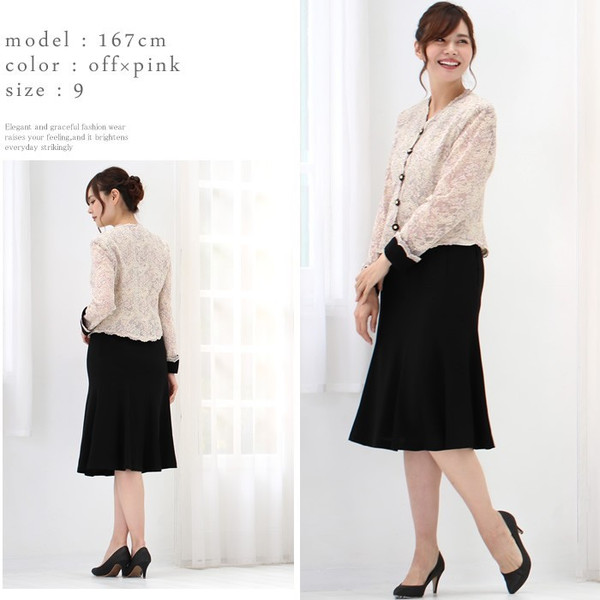 JUGEMテーマ:結婚式 上下別サイズ選べて単品でもOKの美しいチュールレースの留袖ドレス https://store.shopping.yahoo.co.jp/koran/ko32-c01.html 色:オフ×ピンク/ブラック×ピンク サイズ:7・9・11・13・15号 価格:34,344円 留袖に並ぶ上品な正装 皆様からたくさんのご好評をいただいているフォーマルドレススーツです。 留袖の代わりとしてご結婚式や披露宴などの際、新郎新婦のお母様へお召頂ける格式ある服装となっております。 生地はブティックコーランが厳選した日本製の糸を使...