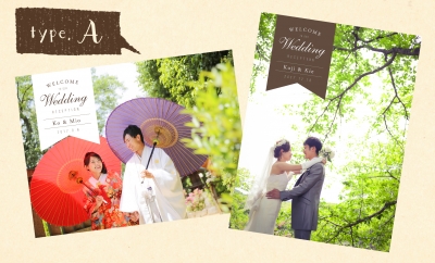 JUGEMテーマ:結婚式 みなさんこんにちは 今回は、以前ご紹介した オリジナルウェルカムボードについて、 もうちょっと詳しくお見せしちゃいます 前撮りやカジュアルフォトのお写真を使って お作りするウェルカムボード。 まずは、4種のデザインのご紹介から 写真そのままの色味を邪魔せず、 どんな写真にもマッチしやすいtype.Aのデザインは、 上品な雰囲気にまとめたい方におすすめ! 写真に施した色...