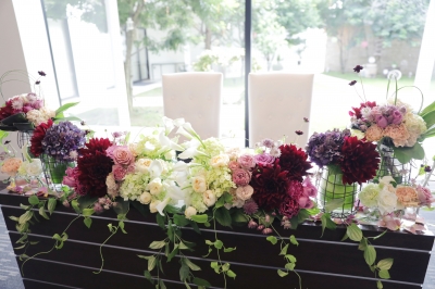 JUGEMテーマ:結婚式 みなさんこんにちは! だんだんと秋めいてきましたね 秋色のお洋服が店先にならび始めると とってもワクワクします 秋色といえば、多くの方が ボルドーを連想するのではないでしょうか? そこで今回は、ボルドーカラーを使った コーディネートをご紹介します! まずはこちら! 深いボルドーのダリアが特徴的な高砂席。 まわりのお花も深みのあるカラーで、 落ち着いた雰囲気がとってもステキで...