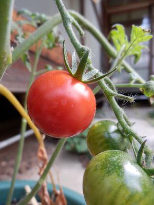 野菜作りの初歩中の初歩、ミニトマト栽培に今年は挑戦中。 なぜならもうすぐ2歳になる娘みほの、トマト大好き。 あればあるだけ食い尽くす。 まだ緑のトマトも容赦なくもぐ始末(笑) 極限まで水やりを控えると甘いトマトになると聞き、 葉っぱがカラカラになって限界を超えるラインまで水を やらずにいたせいかなかなか赤くならなかったのだけれど、 ようやく1個だけ真っ赤に熟したので収穫です♪ トマト泥棒さん、すぐに赤いトマトを発見!一口でパクリ! ・・・しまった!!1個しかないのにみほのが食べちま...
