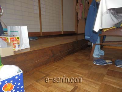 廊下から台所へ・・・約30cmの段差があって、とても不自由な思いをしておられました。元気な内は何ともなかったのですが・・・少し高齢になってくると、とても危険な段差です。ここの段差を解消しようとすると・・・床面を30cmほど持ち上げるので、より、天井が近づいてきます。では、天井を持ち上げようと・・・天井裏をのぞいてみると、そこには。。。太い丸太が・・・交差しているので、天井が仕方なく貼ってありました。「どげんかせんと!(ふるっ!)」天井を撤去します。部屋の真ん中に・・・屋根構造を支えている重要な柱もあ...