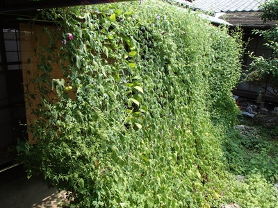 いつまでも手足口病のブログで止まっててすみません。もうほとんど治りました。で、蒸し暑いので爽やかなネタを。。ジャーン!(って古いのかな)エコカーテンがこうなりました。茂った茂ったやったね裏から見るとこんな感じ。立派に日差しを遮ってくれてます。ゴーヤ、フウセンカズラ、ツルムラサキ、スイートピーという混合エコカーテン。スイートピーの花ってこんな感じなんですね。知らなかった。ゴーヤもちゃんと出来て食卓に。路地植えにしたのが良かったのかな。でも実は下っ葉が黄色くなってきています。密集して植えたせいな...