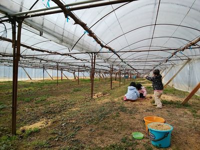 昨年、お手伝いに行っていたぶどうのさの農園さん。 わさわさ生えていた葉も枝もすべてなくなってスッキリ! 丸裸になって枯れ木のようにしか見えないぶどうの木。 枝を全部落とした状態で根が水をしっかり吸い上げ 幹に栄養を蓄えて暖かくなる春を待ちます。 剪定したぶどうの木の枝で焼き芋をするというので、 保育園のお友達を誘ってみんなで遊びに行って来ました♪ 寒〜〜〜いのも子どもたちはへっちゃら、 外で駆け回りハウスの中...