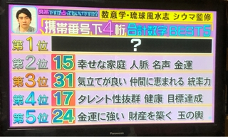 JUGEMテーマ:占い TV番組『突然ですが占ってもいいですか?』を見ていたら、数意学&琉球風水志のシウマさんが、携帯電話の番号下4桁の合計で今年特に運気の良い番号を発表! なんと!私の番号17は第4位! タレント抜群、健康、目標達成だとか。 大いに期待しましょう!!