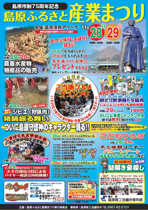 JUGEMテーマ:自転車 今週土日 11/28(土)29(日)に、島原ふるさと産業祭りが開催されます 食の宝庫『しまばら』発信! 島原市の産業や商品をPRするために開催されているお祭りです。 産物・お菓子類・鍛冶屋等、さまざまなお店や団体が約100程出店し、多くの方が来場します。 農産物では、野菜の販売・農産物品評会・即売会が、水産品では、詰め放題・魚の競市が人気です。 食事コーナーも設置され、会場で販売されている食べ物を食べることもできます。 食べて、買い物して、遊んで、家族で楽しめるイベン...