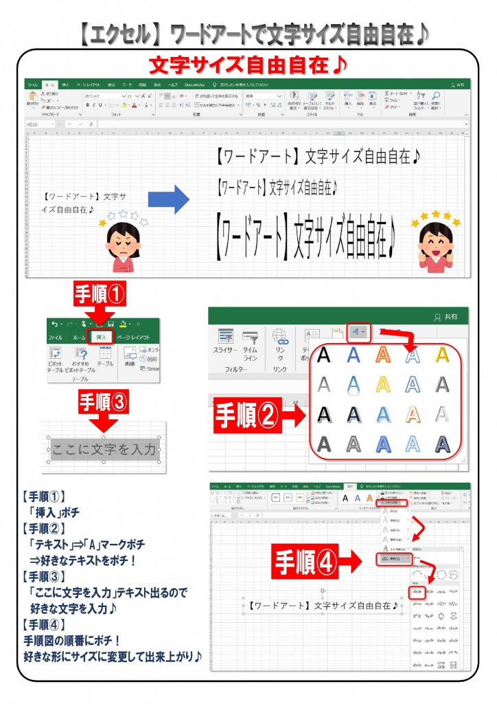 JUGEMテーマ:エクセル 【エクセル】ワードアート《文字サイズ自由自在♪》 エクセルを使用していて、不便に思うことはたくさんあります。 その中でも、文字テキストを使用した際、 文字が欠けていたり...変な箇所で折り返されていたり...と困ったことはありませんか? そんな時は、エクセルの「ワードアート」が便利です♪!(^^)! 好きなサイズで自由自在に文字をレイアウトできます! まだ、使ったことないよって方はぜひ使ってみてください!
